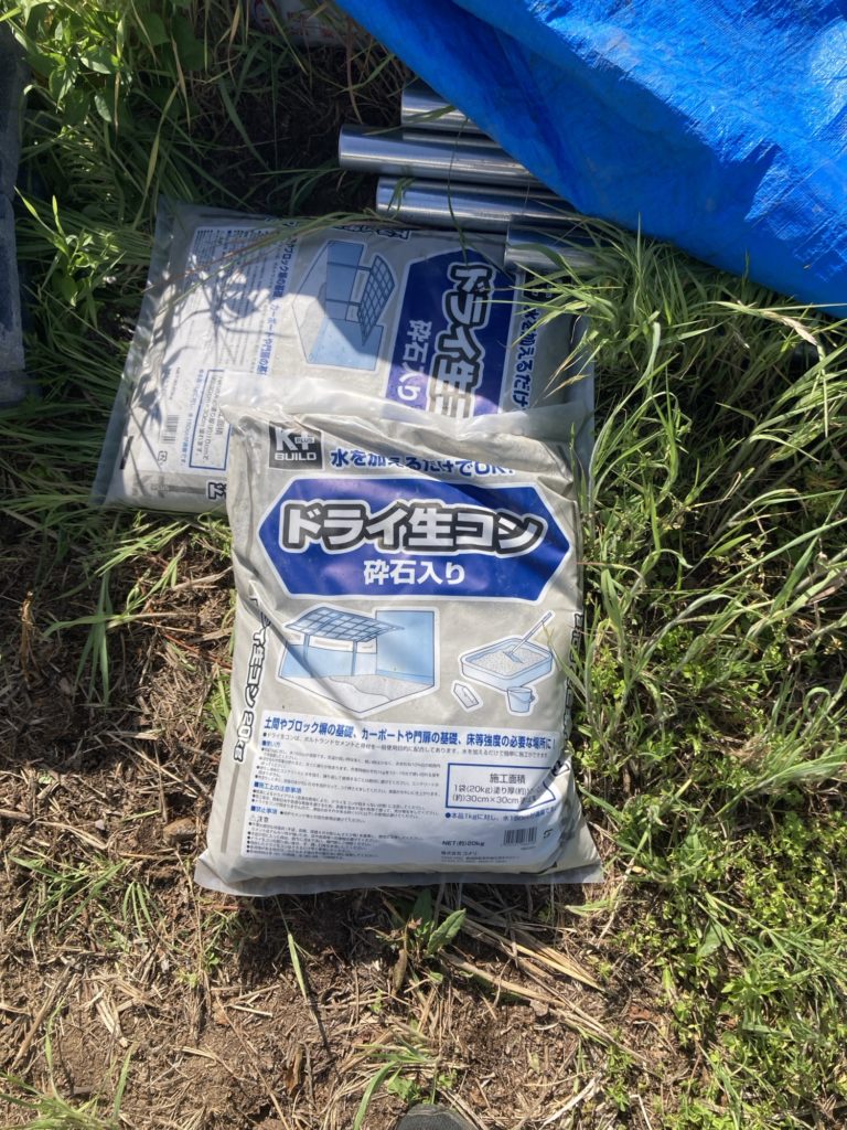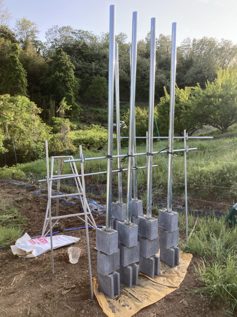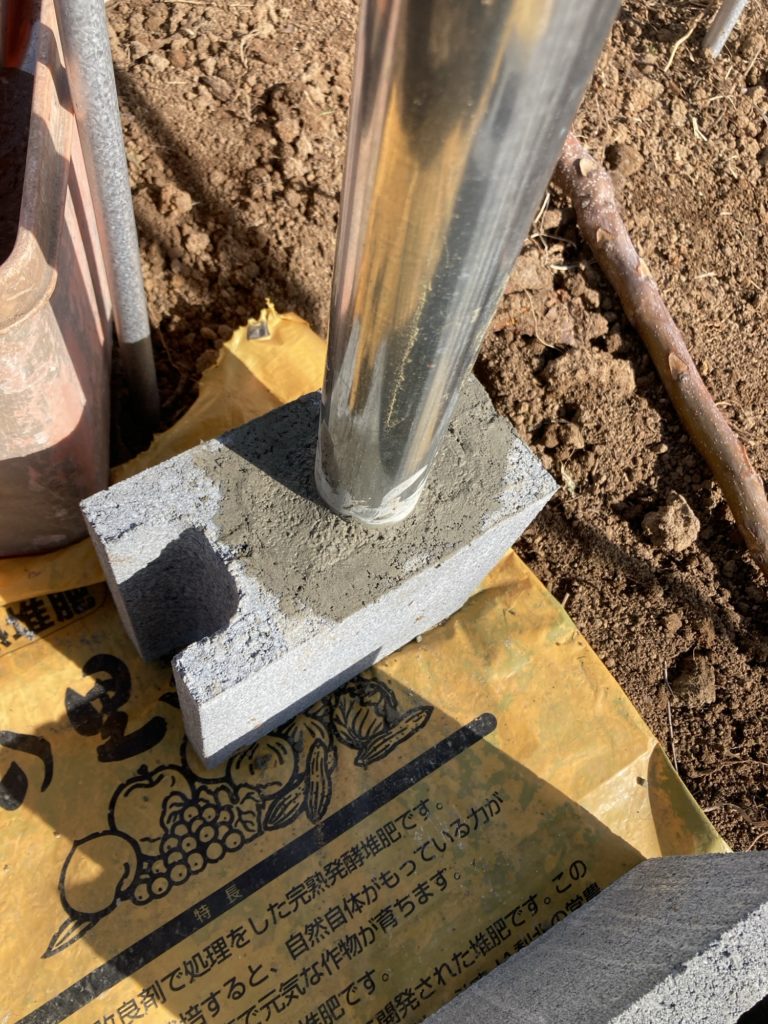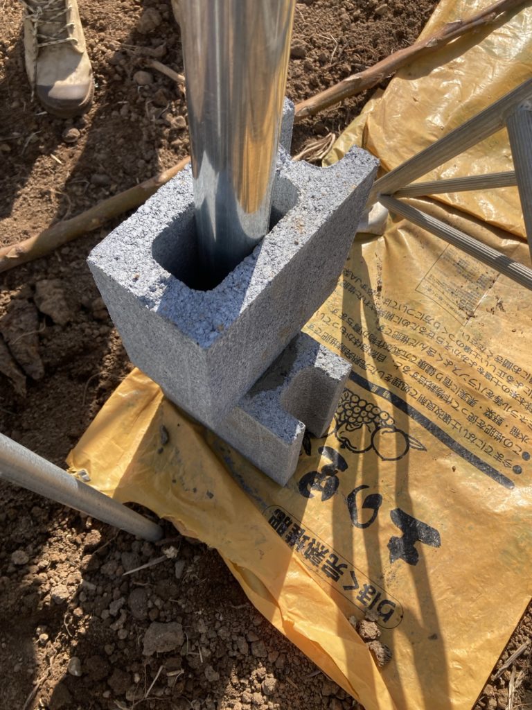 投稿日: 2025年5月3日ブドウ棚制作の準備 半ブロックを買いました。 水を加えるだけのコンクリートを買いました。さらに、単管パイプも買いました。 容器にコンクリートの粉と水を入れ、よく混ぜます。 単管パイプとブロックの穴の隙間にコンクリートを流し込みます。 ブロックは90度ずらします。 こちらが完成品です。